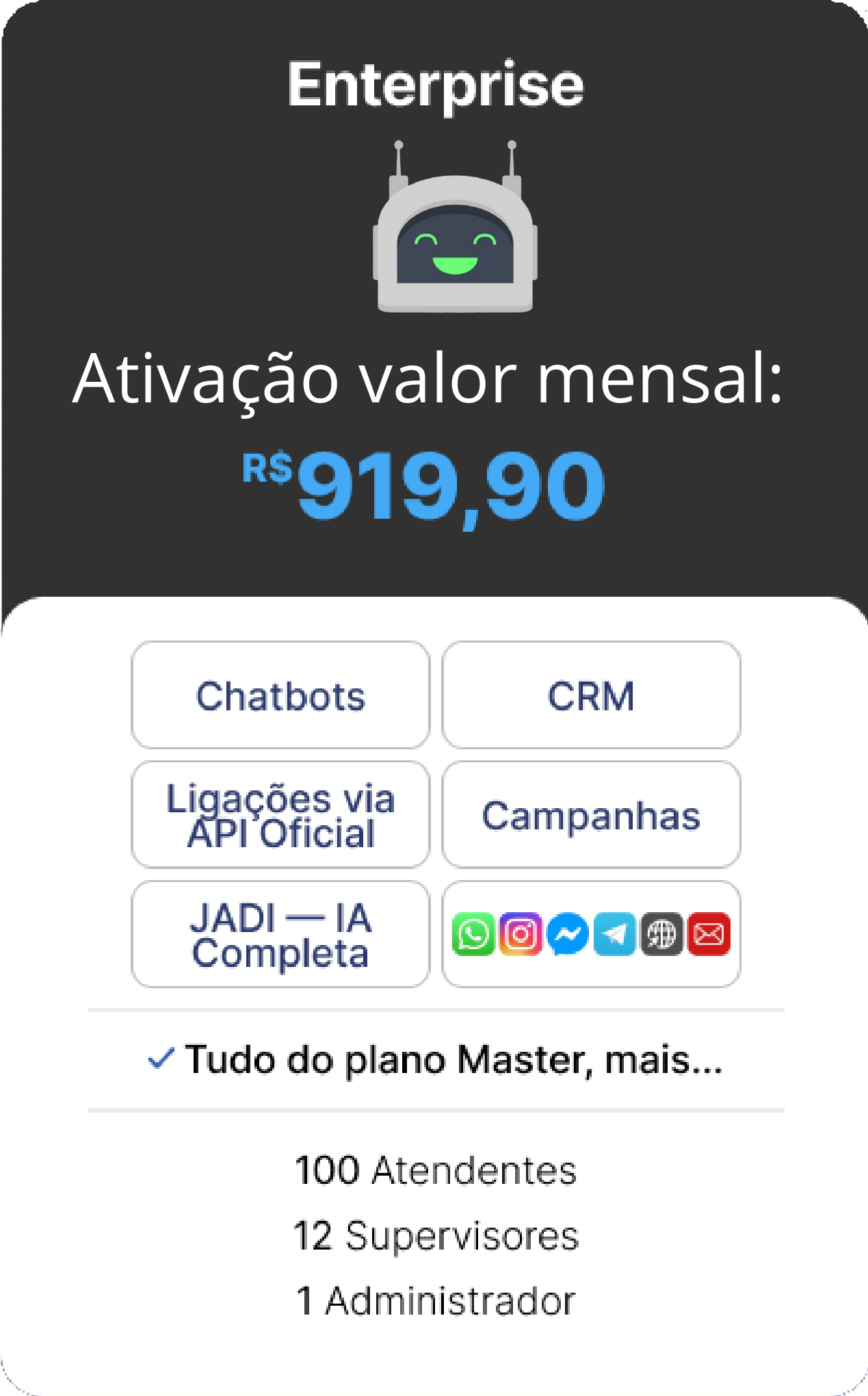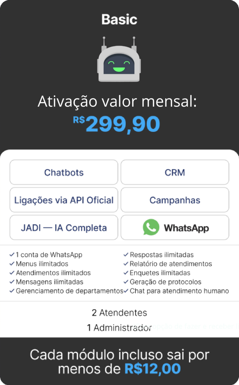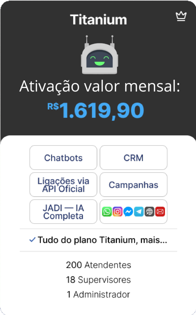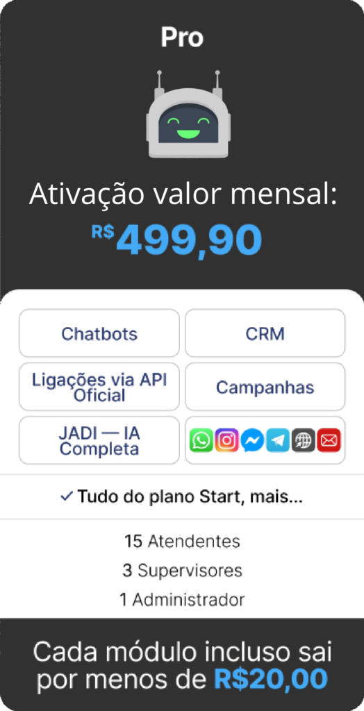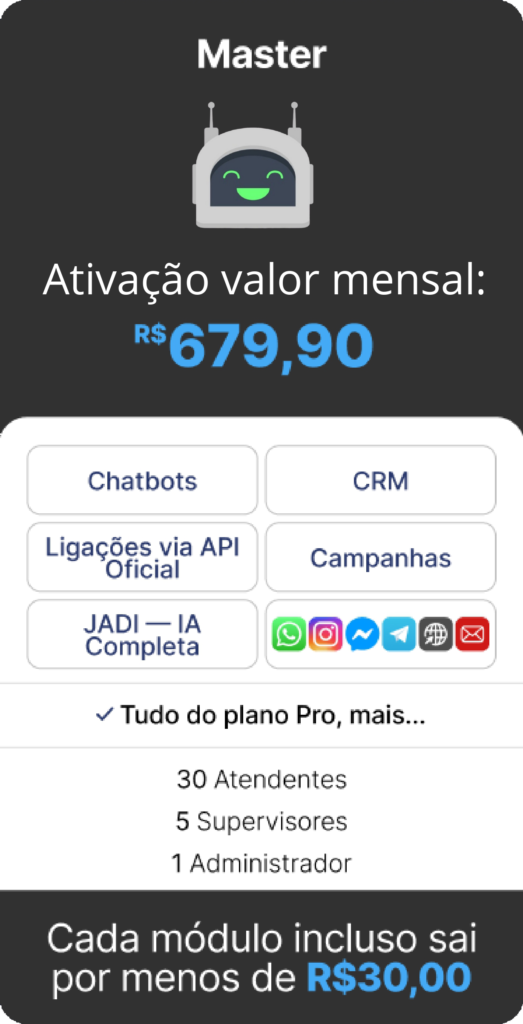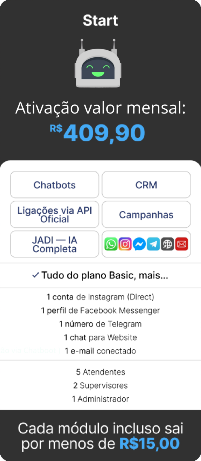 OBS.: TODOS OS CUSTOS REFERENTES A COBRANÇAS FEITAS PELA API OFICIAL DA META SÃO DE TOTAL RESPONSABILIDADE DO CONTRATANTE E SÃO NECESSÁRIAS PARA A ATIVAÇÃO DAS FUNCIONALIDADES DO CHATBOT. A ATIVAÇÃO DA JADE IA REQUER TOKEN (CHATGPT OU COPILOT) FORNECIDO PELO CLIENTE.