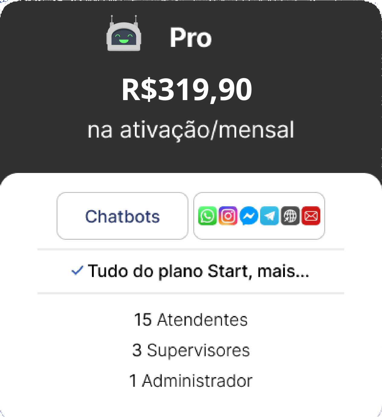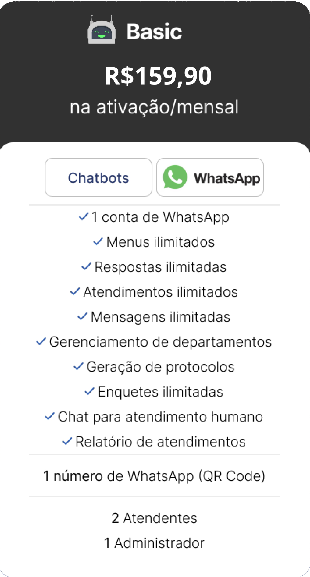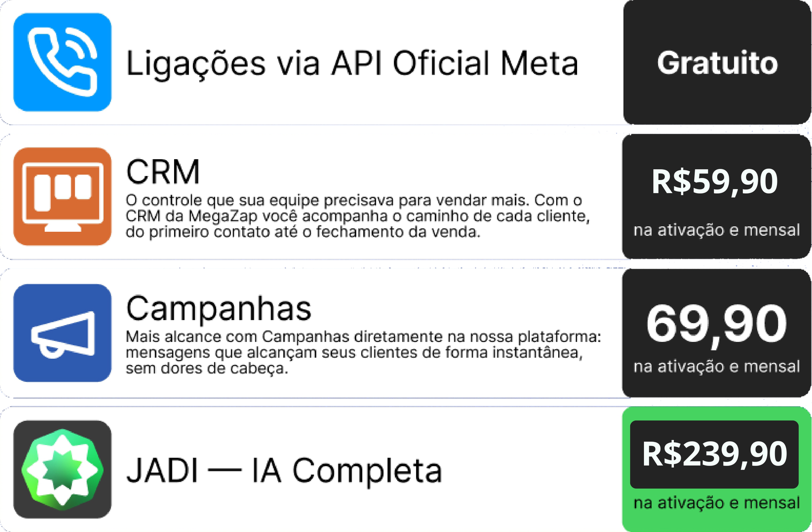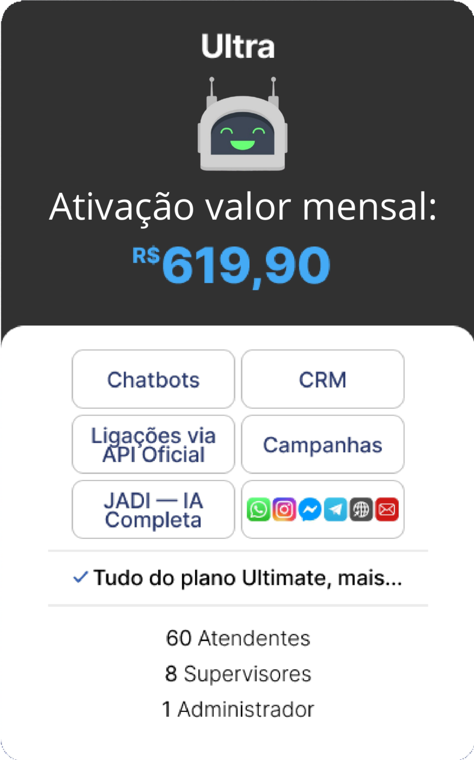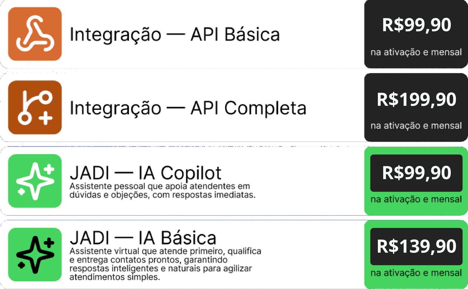 OBS.: TODOS OS CUSTOS REFERENTES A COBRANÇAS FEITAS PELA API OFICIAL DA META SÃO DE TOTAL RESPONSABILIDADE DO CONTRATANTE E SÃO NECESSÁRIAS PARA A ATIVAÇÃO DAS FUNCIONALIDADES DO CHATBOT. A ATIVAÇÃO DA JADE IA REQUER TOKEN (CHATGPT OU COPILOT) FORNECIDO PELO CLIENTE.